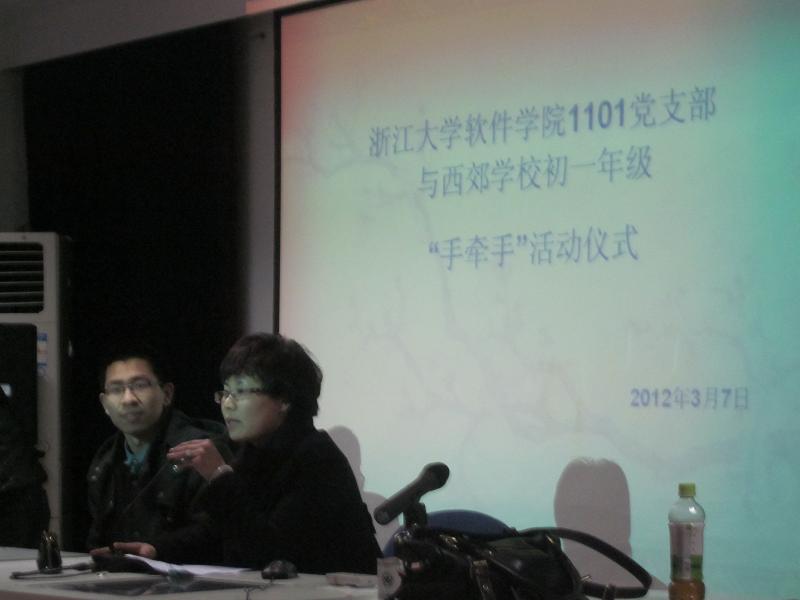 2012年3月7日,宁波海曙西郊学校的多媒体教室里暖意融融,由我院1101党支部17名党支部成员外加4位同学组成的支教小组在党支部书记胡柳凯,副书记陈莉莉和支委俞文昊的组织下,与西郊学校初一年级的同学们正在进行一场别开生面的“手牵手”活动见面会。