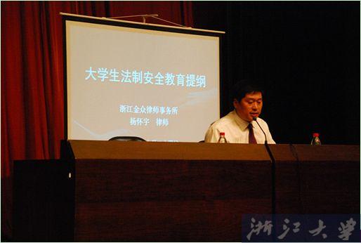 为增强学生的安全防范意识和法律意识,提高学生的自我保护能力,我院特邀浙江金众律师事务所杨怀宇老师于2012年9月25日晚,在学术交流中心,为同学们进行了《大学生常见法律安全问题预防与处理》讲座。讲座由浙江大学软件学院主管安全保卫工作的姚国友老师主持,软件学院全体2012级研究生均参加了此次讲座。