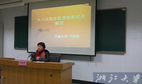 严建雯老师首先用四个词概括了对十八大报告的总体印象,分别为:清醒、自信、坚定和开拓。随后,严建雯老师从党的指导思想及行动指南、中国特色社会主义、全面建成小康社会三个方面作了详细讲解。严老师指出,十八大有一精彩之笔,它集中阐述了毛泽东与中国特色社会主义之间的关系,报告以历史为线索,指出以毛泽东同志为核心的党的第一代中央领导集体,在新的历史时期为开创有中国特色社会主义提供了宝贵经验、理论准备以及物质基础。接下来,严老师重点介绍了十八大报告的六个新亮点,分别为:提出城乡居民人均收入10年翻番、我国发展仍处于可以大有作为的重要战略机遇期、“五位一体”的总体布局、社会主义核心价值体系的新概括、社会主义协商民主是政治体制改革重要内容、对党的建设主线作了概括。最后,严老师结合实际讲解了习近平总书记关于加强作风建设的指示和中央政治局通过的八项规定:政府应由消耗型向服务型转变。在介绍“我国发展仍处于可以大有作为的重要战略机遇期”时,严老师结合当前国际形势进行深入分析,指出我国目前仍然面临多重外来压力,国内发展也存在一些问题,挑战与机遇是并存的。