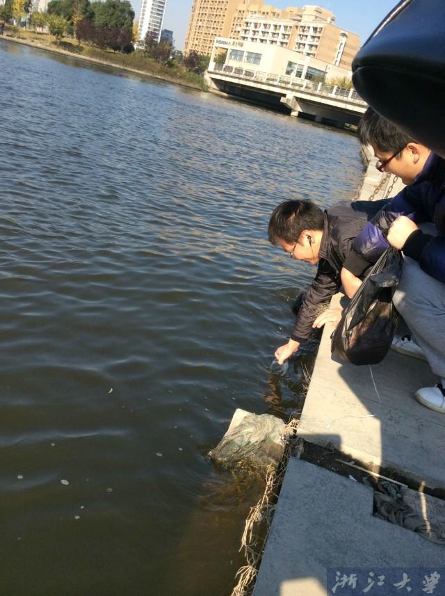 带着我们的横幅,先在学校里活动。下图为在学校甬新江边活动。