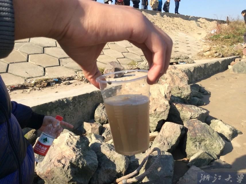 取水进行观察,结论是甬江的水特别浑浊,泥沙比较多