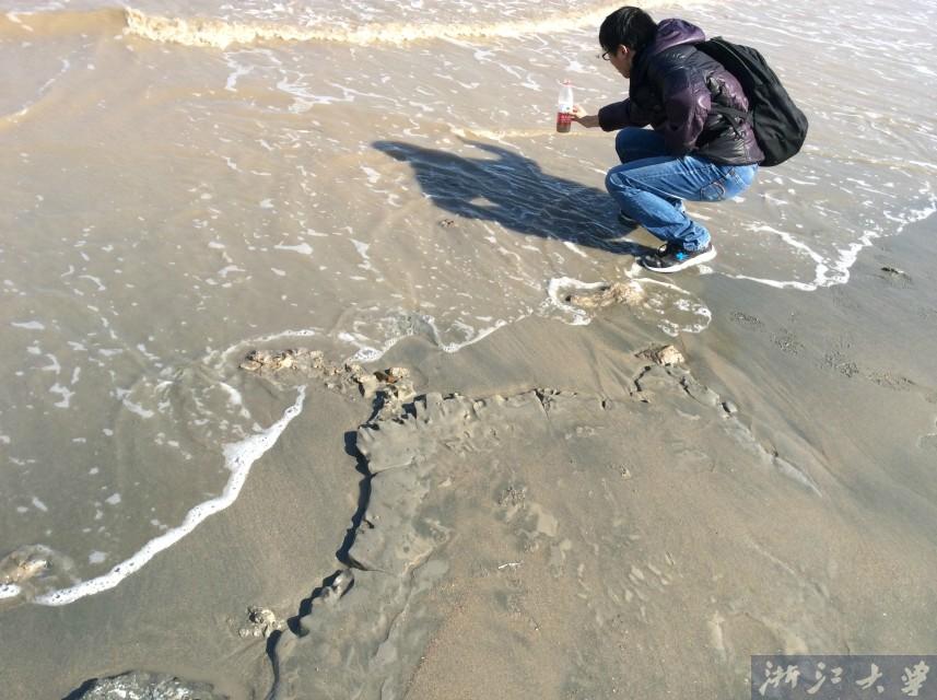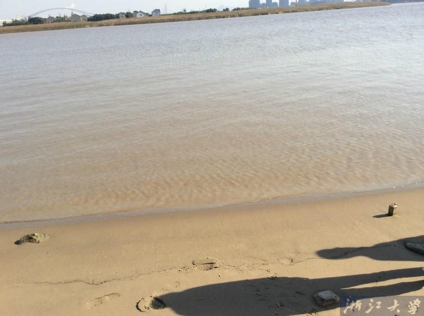 然后我们到了甬江入海口附近的海湾取水,水质特别浑浊,而且特别黄。