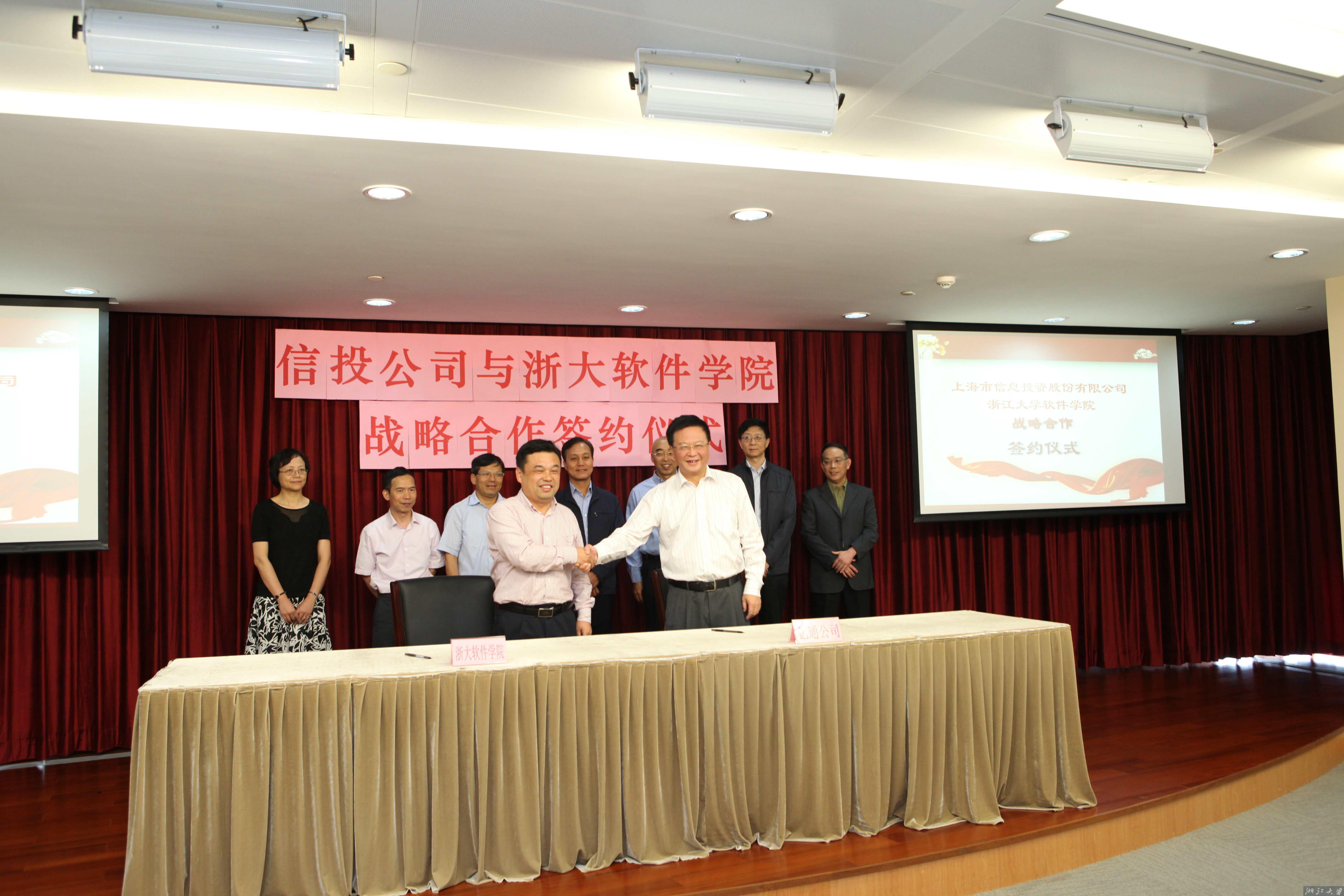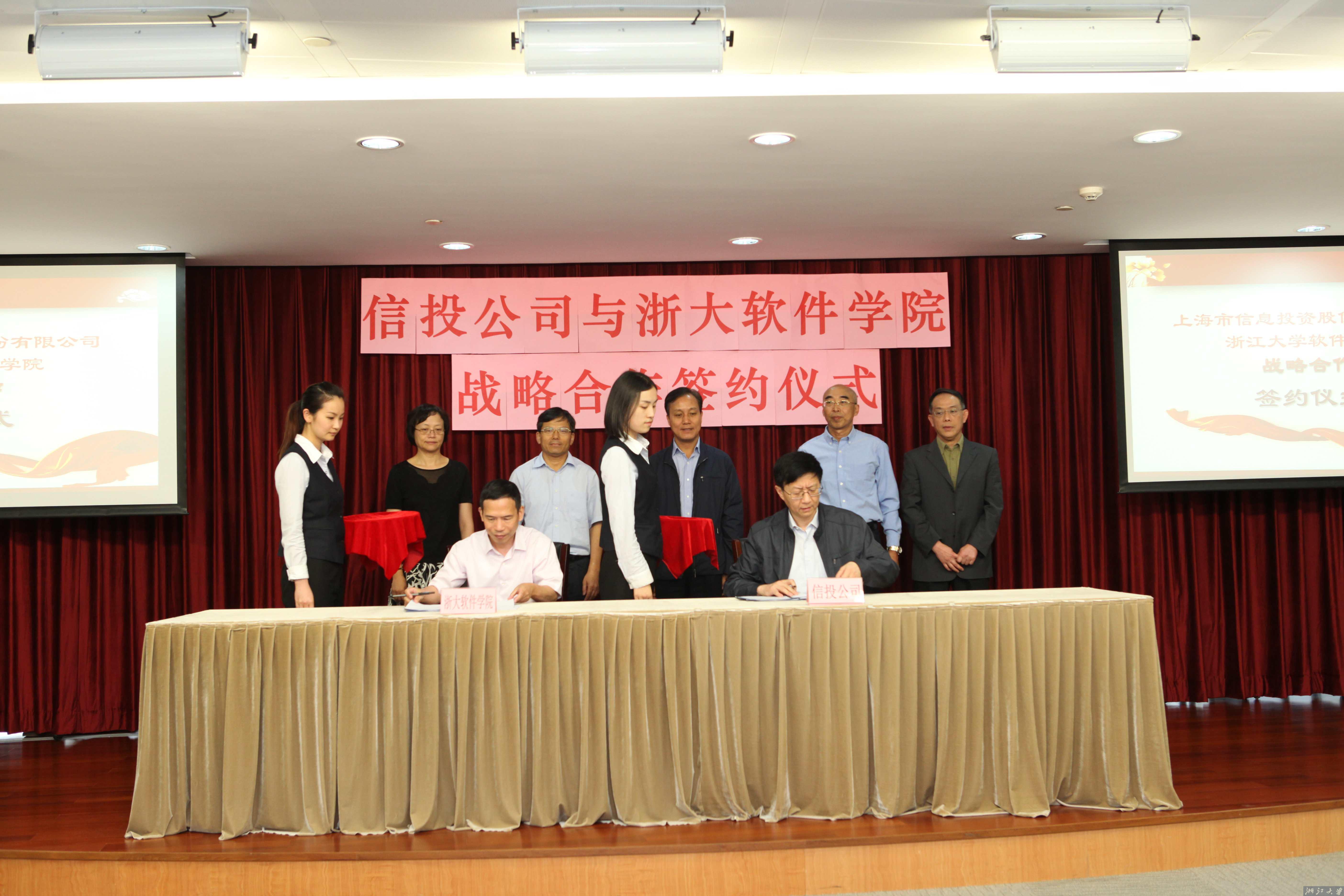 2014年6月18日,上海市信息投资股份有限公司与浙江大学软件学院在上海浦东举行合作设立大数据研究院战略框架协议签约仪式。信投公司全体领导班子、产学研工作组、主要投资企业负责人,浙江大学软件学院原院长陈纯教授、常务副院长杨小虎、党委书记冯雁、副院长干红华及专家教授代表等出席仪式,信投公司党委副书记张宏伟主持仪式。签字仪式上,信投公司钟振良副总经理致欢迎词,干红华副院长回顾了双方合作历程,杨小虎常务副院长与信投公司林立副总经理分别代表双方签署了战略合作框架协议; 干红华副院长与上海亿通国际股份有限公司李伟达总经理分别签署了技术研发项目合作协议。最后,陈纯老师与信投公司刘亚东董事长分别发表了热情洋溢的讲话,对大数据研究院成立表示祝贺,并对合作寄于厚望。