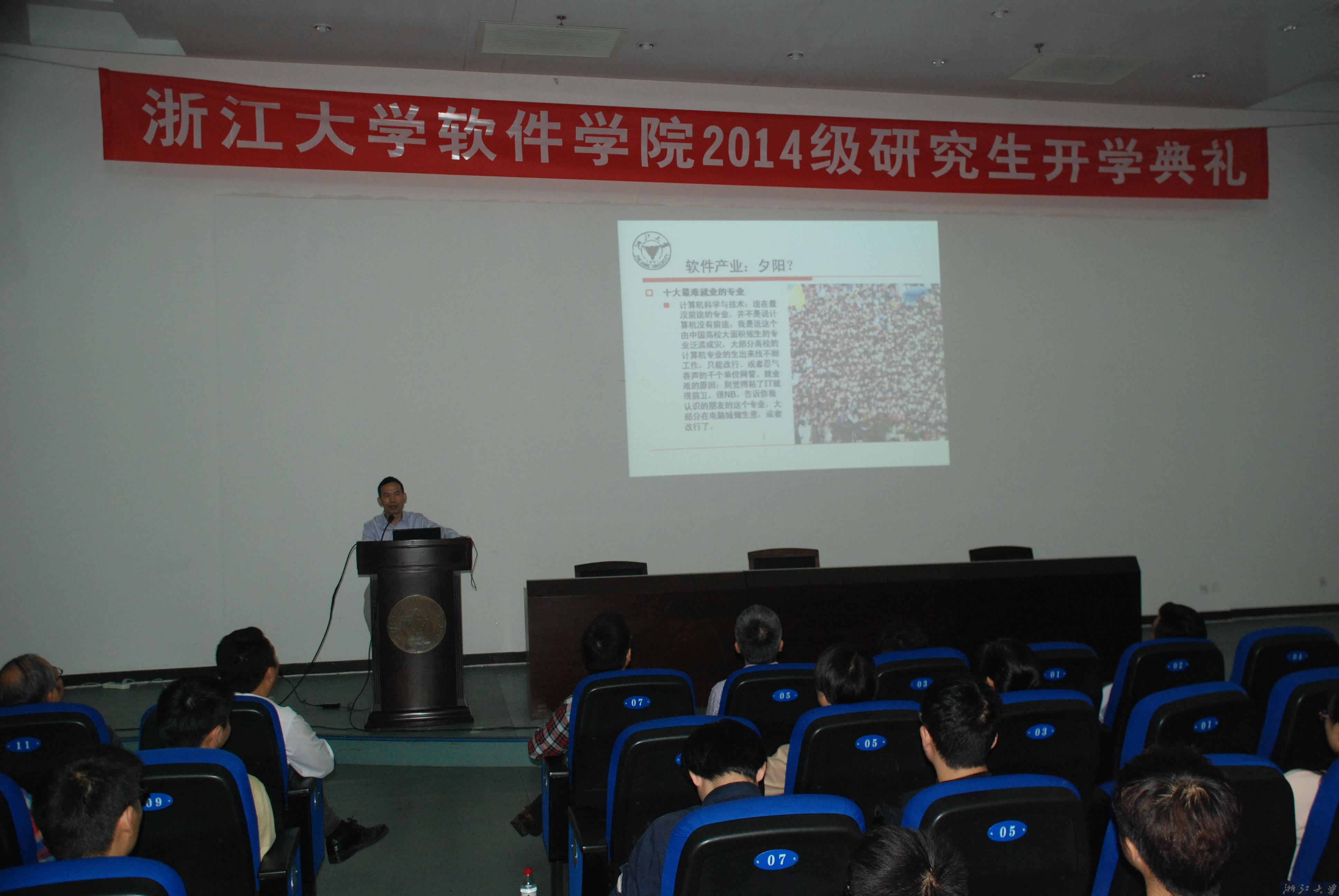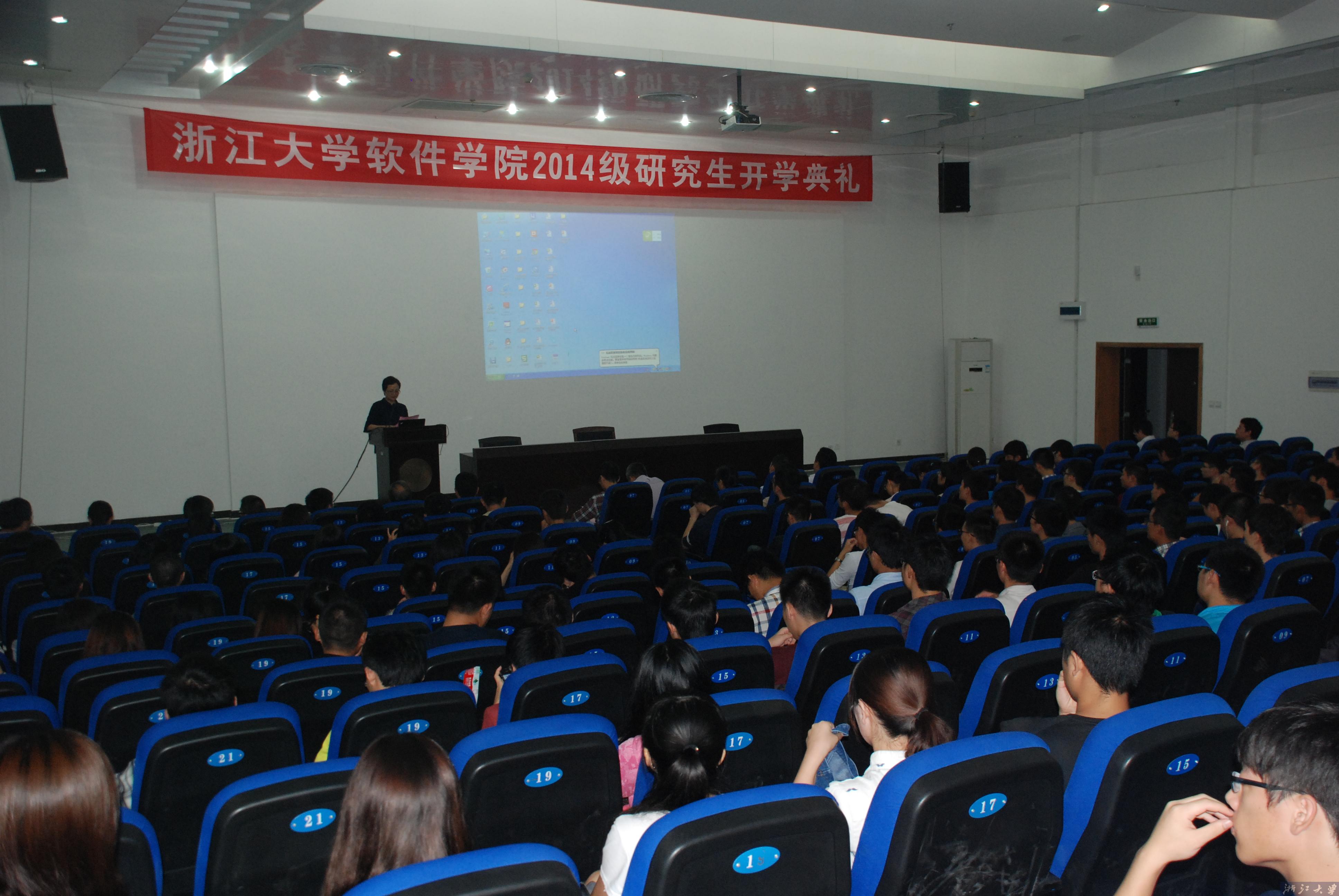 2014年9月22日,浙江大学软件学院2014级研究生开学典礼暨院长报告会在软件学院三楼报告厅隆重举行。软件学院常务副院长杨小虎、计算机学院与软件学院党委书记冯雁、软件学院副院长干红华、卜佳俊,计算机学院与软件学院党委副书记胡昱东、各专业各部门老师以及全体2014级研究生同学出席了本次开学典礼。开学典礼由胡昱东老师主持。