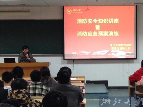 为提高防火减灾安全意识,普及消防安全知识,2014年12月1日,软件学院邀请高新区消防大队为学院学生开展了一场消防安全知识的讲座。讲座在教学楼N312举行,由浙江大学软件学院主管安全保卫工作的姚国友老师主持,消防大队金杭潮指导员做了关于消防安全知识的主题讲座。
