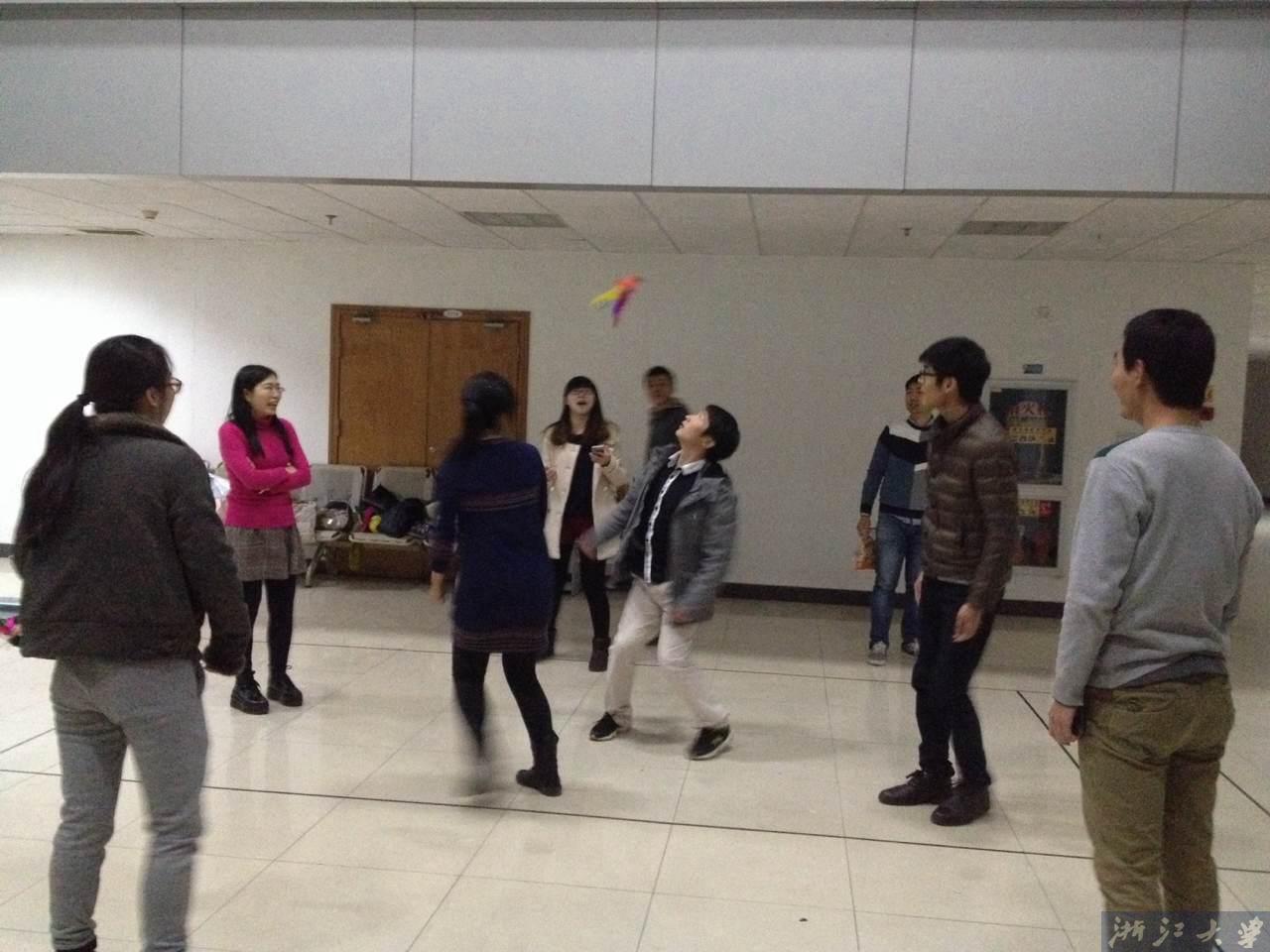 同城党团支部同学相聚于大家熟悉而亲切的学院教学楼大厅。活动分为两个环节。由于冬季天气比较寒冷,我们先举行了趣味运动会进行热身,项目有指压板接力跳绳、踢毽子、躲避球、5人6足共4个环节。