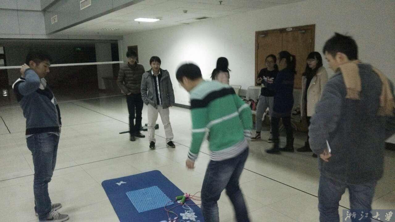 第一个游戏是指压板接力跳绳,虽然在《跑男》里能经常见到指压板的身影,但对于我们来说它还是个陌生的玩意,到底有没有传说中的那么可怕,试试不就知道了!我们的挑战是每个人在指压板上跳绳20次,用时少的那组获胜。为了为团队争取荣誉,每个同学也是蛮拼的,虽然脚底生疼,但还是痛并坚持着。