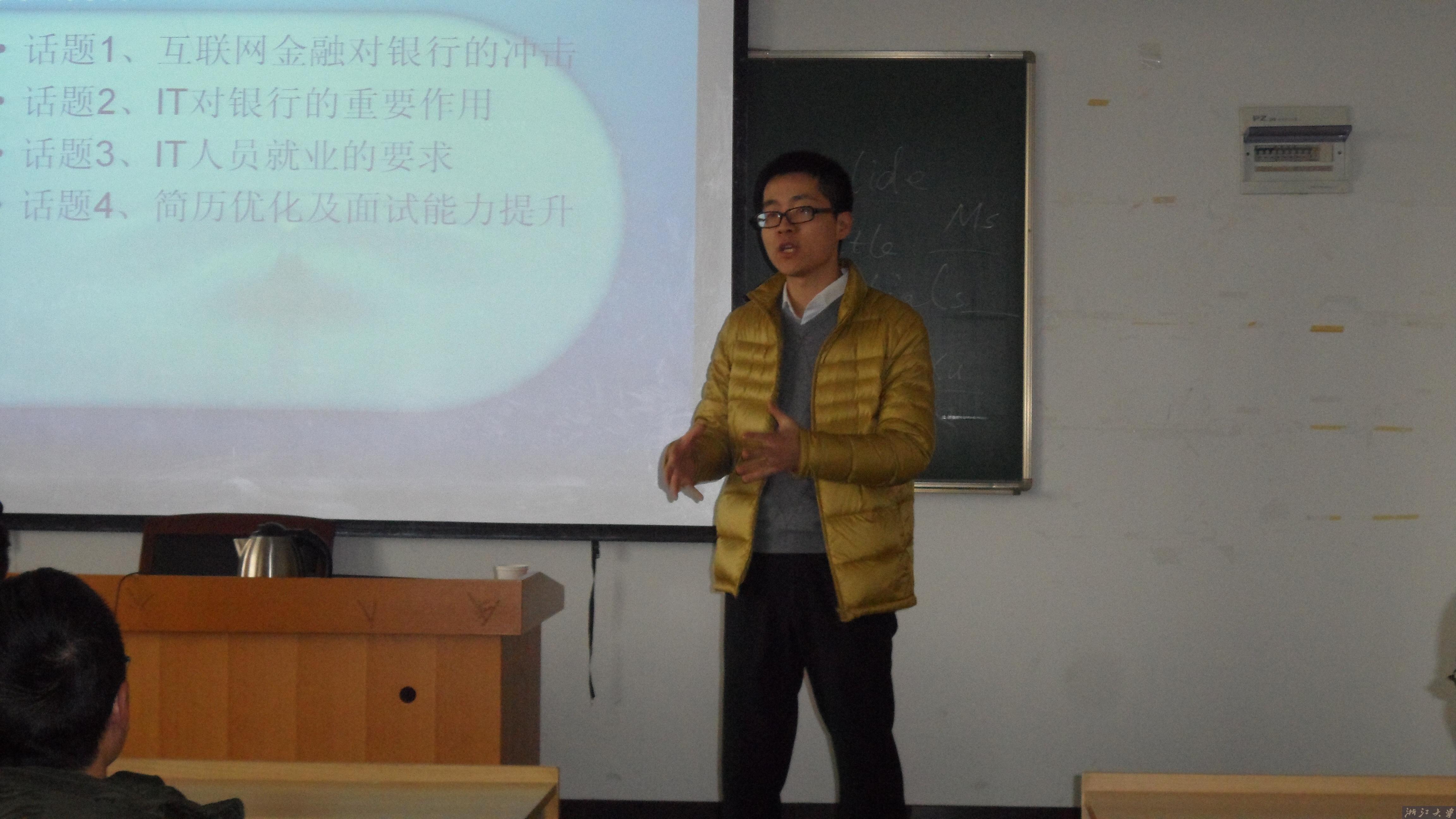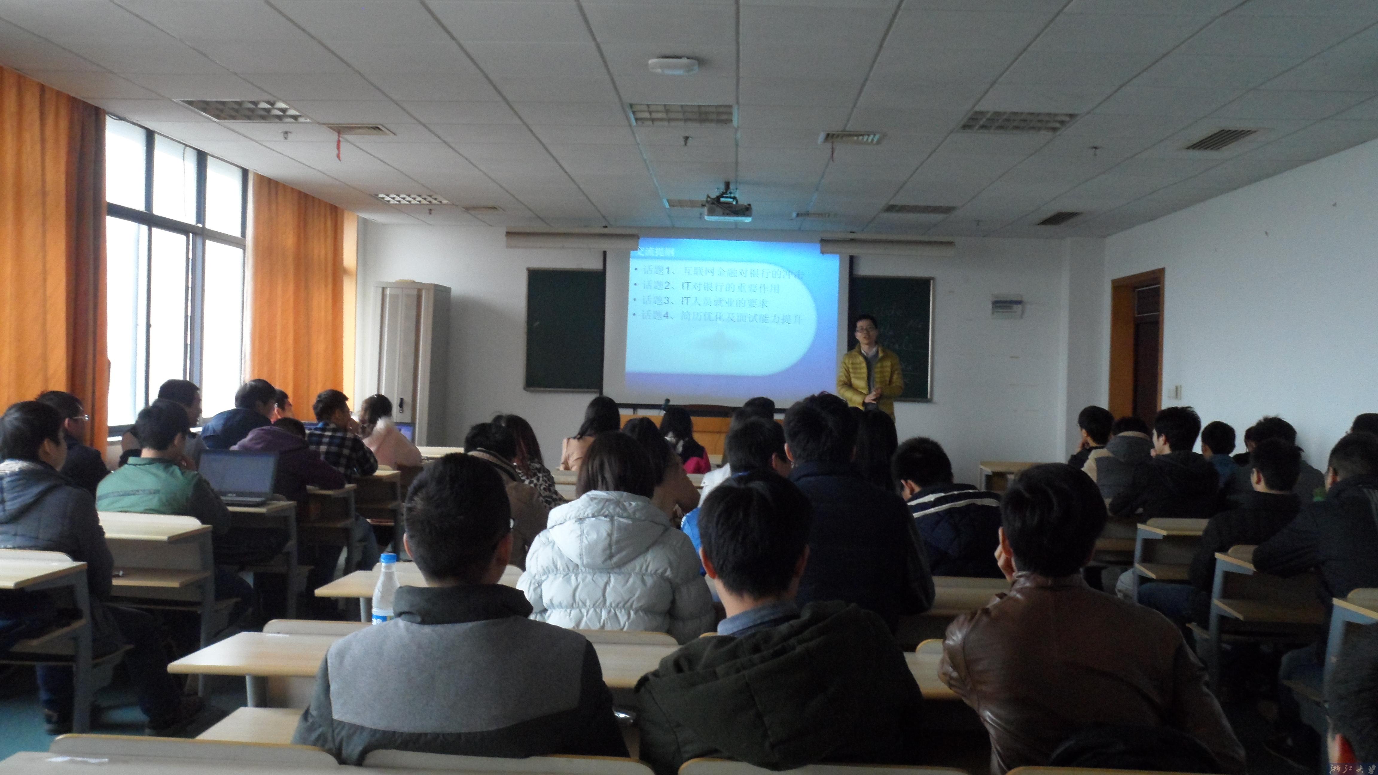 讲座首先借助“银行也是弱势群体”这一两会热点新闻为切入口,分别就互联网金融对银行的冲击、银行的“危”与“机”、银行的出路在哪里等三个话题进行深入阐述当前银行的发展现状,让同学们更加全面的认识未来金融业的发展趋势。随后,对当前及未来银行对IT人员的需求进行展望,并详细讲解了部分岗位的具体要求与面试技巧。