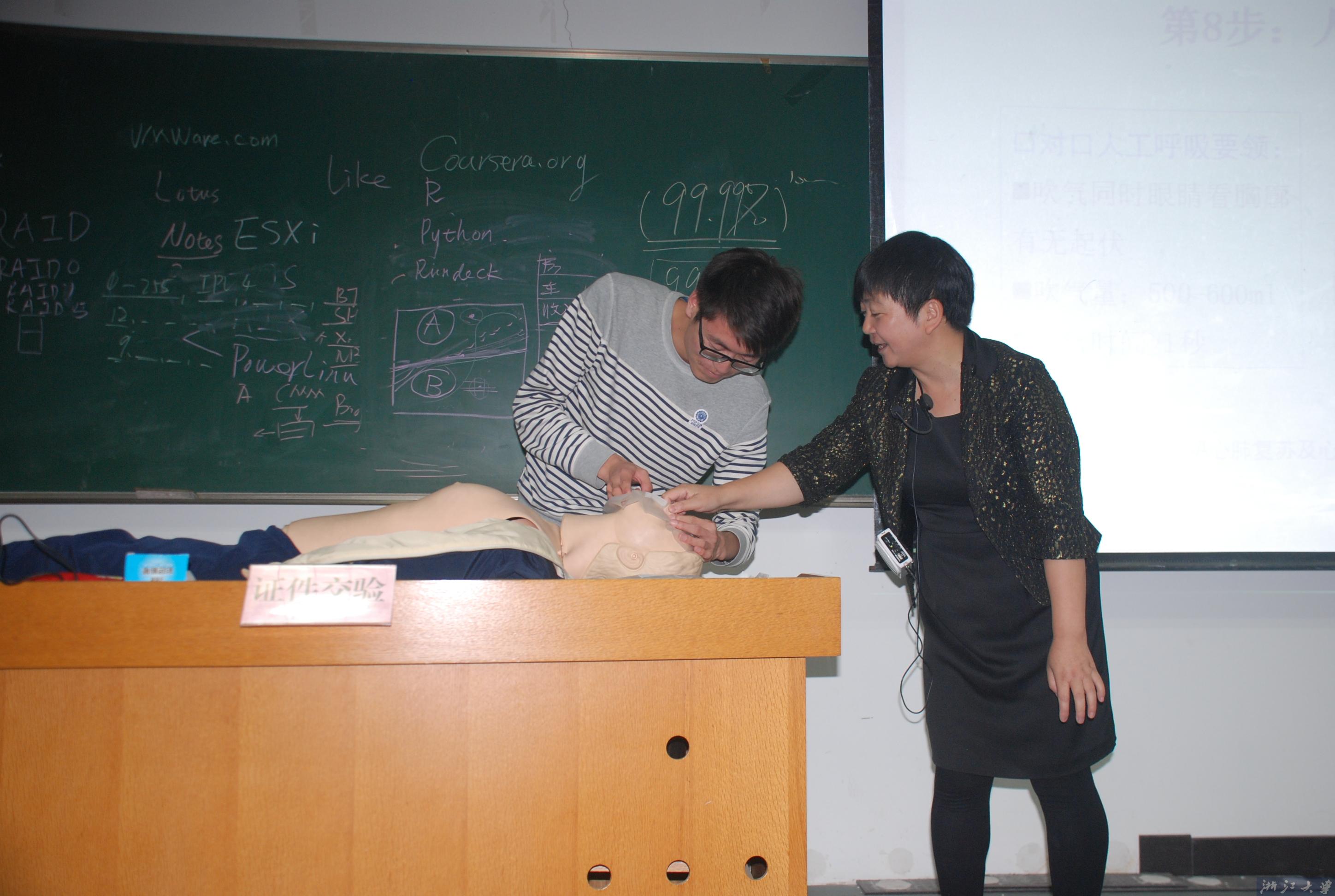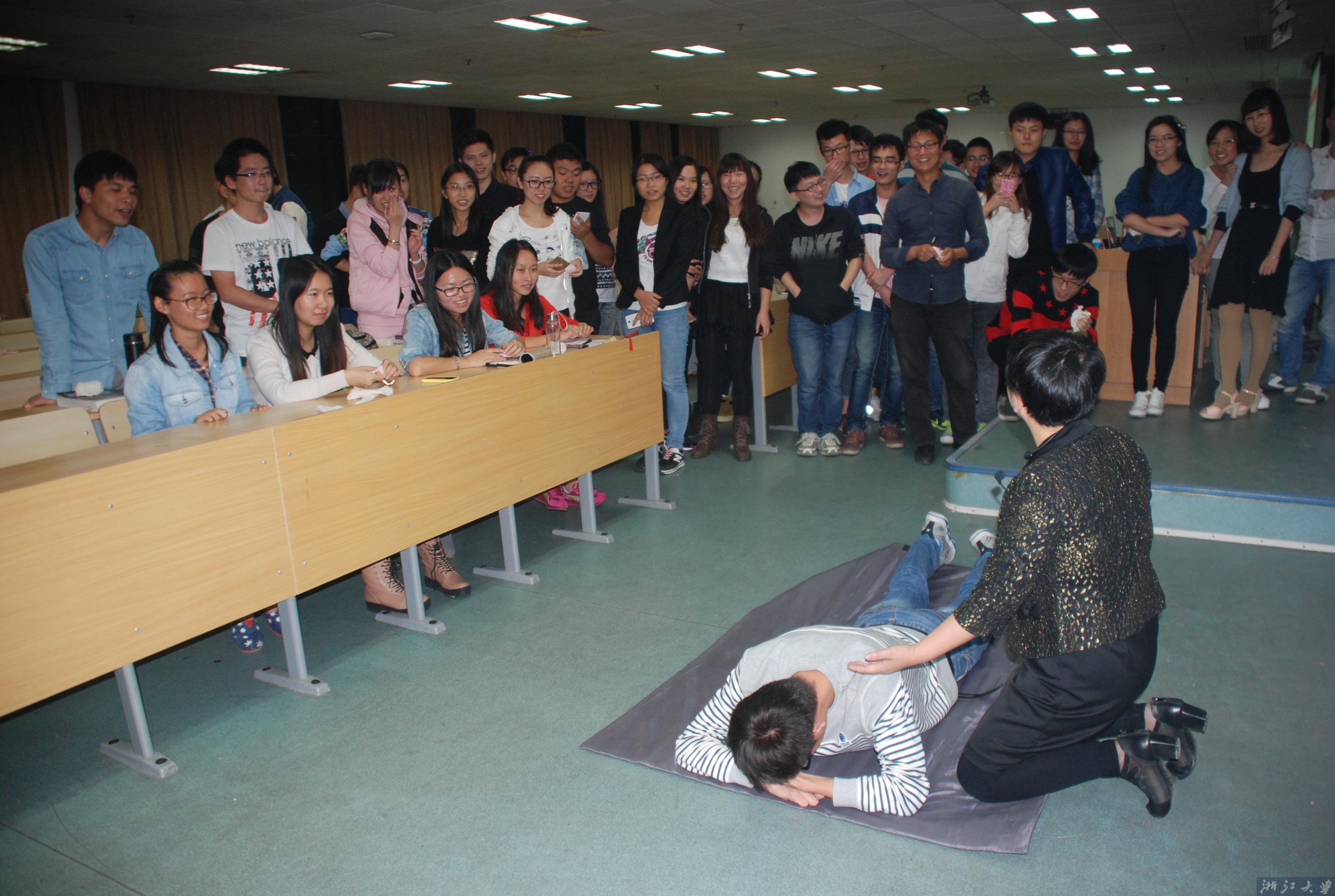 在讲座的过程中,童老师为大家生动形象的讲解了救护的基本知识,包括止血方法、常见外伤、开放性气胸、烧烫伤、心跳复苏、肢体断裂等处理方法及注意事项。同时,童老师在现场准备了一个仿真人偶,在讲解的时候边进行现场演示,并现场以两个同学为一组进行绷带包扎和仿真人体上练习了心肺复苏整套流程的试验,在场的同学们积极性很高,在老师的细心知道下,基本掌握了应急的要领,对于同学们出现的一些错误动作也得到了及时的纠正。整个现场充满了欢声笑语,同学们在轻松的环境下学到了常见应急救护的基本方法。