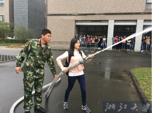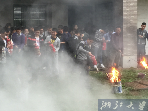 随后,同学们在姚国友老师、欧阳润清老师和消防官兵的指导下现场进行了火灾逃生演习。同学们在老师们的组织下,从安全通道迅速有序地撤离。到达指定场所后,消防官兵向同学们讲解了灭火器、水枪的使用方法,并现场对使用灭火器、水枪扑救火灾的具体步骤进行了演示,同学们纷纷主动上前对灭火器材的操作进行了亲身体验。现场气氛活跃、井然有序。