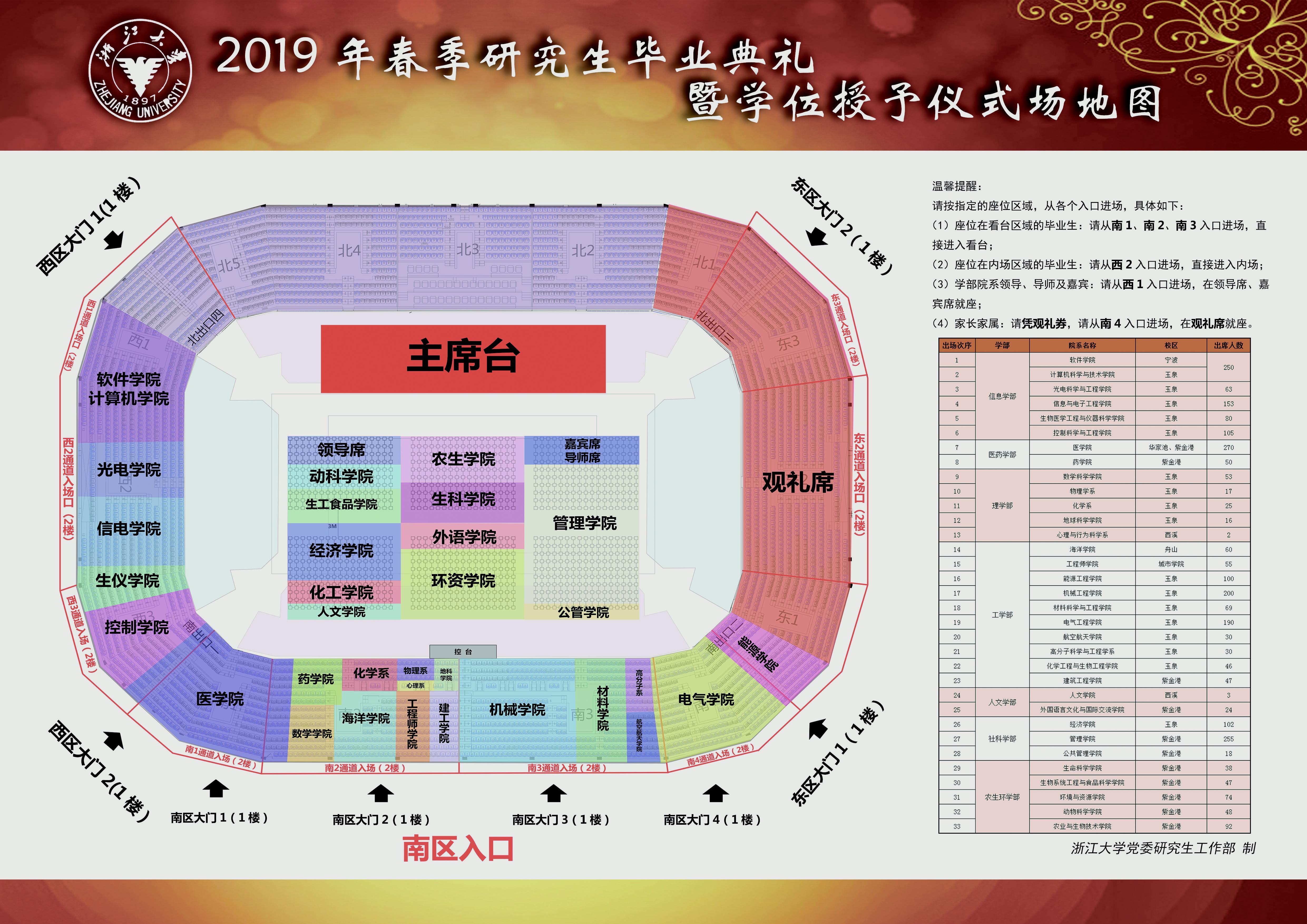 5.家长家属凭观礼券从南4门入口进场,在观礼席就座。导师请持邀请函从西1门进场,在导师席、嘉宾席就座。七岁以下儿童谢绝入场。有需要的同学、导师,可在3月29日(周五)领取学位服时一并领取观礼券、邀请函。