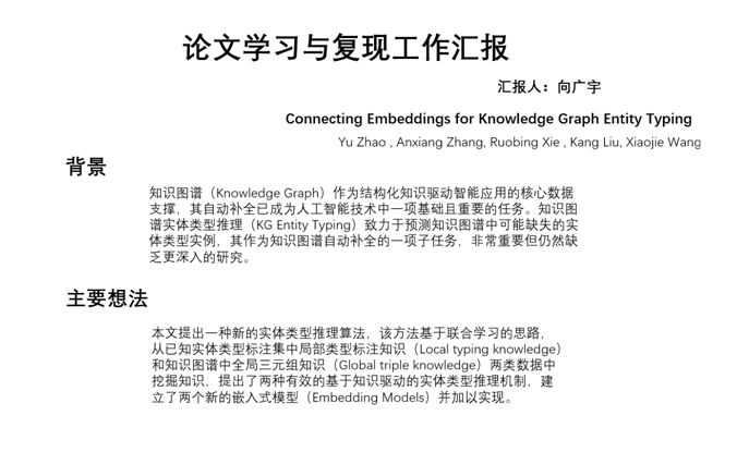 在浙大软件学院夏令营活动中,老师提供了几份有关知识图谱的最新成果供我们学习,通过论文阅读我大概了解了该领域的一些基本情况。通过为期一周的学习和复现过程,我学到针对该问题的思考和分析方法,了解了该邻域问题研究工具,同时也对该领域有了自己的思考和理解。下图是我答辩汇报时ppt的首页内容: