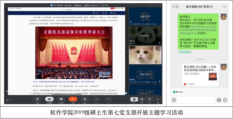 10月13日,软件学院2019级硕士生第七党支部依托浙大钉APP开展了主题学习活动。大家共同观看了习近平主席向国家勋章和国家荣誉称号获得者颁授勋章奖章并发表重要讲话视频,支部书记吴紫妍带领大家共同学习习近平总书记讲话精神。支部党员周鸿岑说,伟大源于平凡努力。从模范的身上,我看到人生本平凡,没有谁生来就是伟大。但英雄无不是在对平凡的坚守中,磨砺了伟大的品质,他们的伟大,无不是以民族富强、人民幸福为追求。