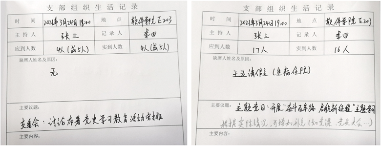 说明:因“应到人数”不同,支委会和主题党日活动须分开记录,主题党日活动、党员大会、党课可合并记录但议题须分行书写(示例见下图)。