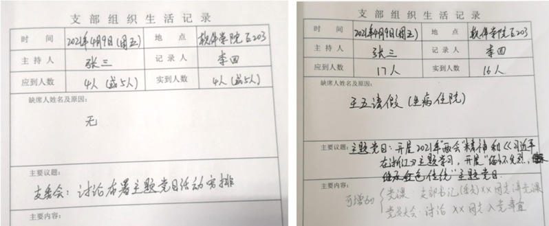 说明:因“应到人数”不同,支委会和主题党日活动须分开记录,主题党日活动、党员大会、党课可合并记录但议题须分行书写(示例见下图)。