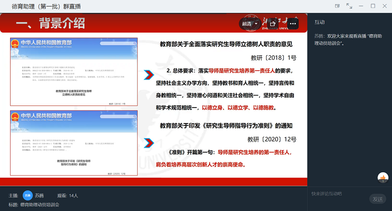 动员培训会上,苏腾老师分政策背景、实施方案、工作职责、联络机制等四个方面,就学院研究生德育助理工作的总体情况进行了介绍,旨在统一思想、正确认知,进一步发挥研究生自我教育、自我管理、自我服务、自我监督作用。动员培训后,与会同学就德育助理工作、近期学习生活热点话题等进行了讨论交流。