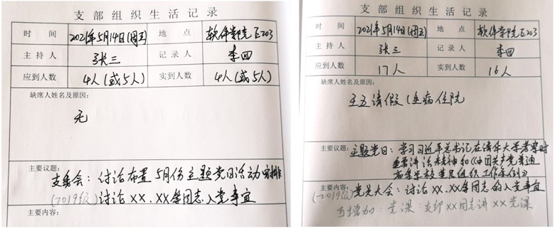 说明:因“应到人数”不同,支委会和主题党日活动须分开记录,主题党日活动、党员大会、党课可合并记录但议题须分行书写(示例见下图)。