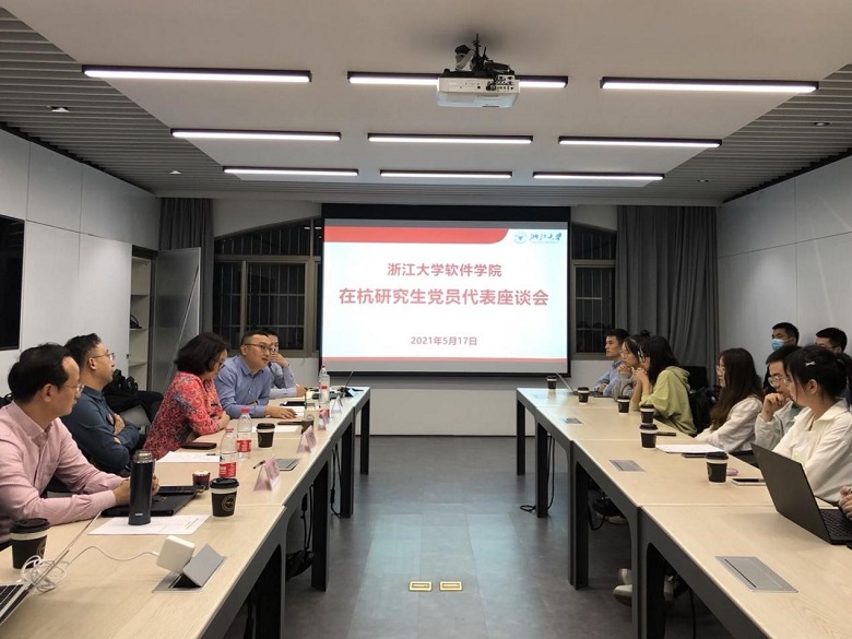 2021年5月17日晚,软件学院在玉泉校区召开在杭研究生党员代表座谈会。学院常务副院长尹建伟,副院长陈丽、蔡亮,党委副书记于翔,学工办主任苏腾和在杭各学生支部党员代表共20余人参加会议,会议由学院党委副书记于翔主持。