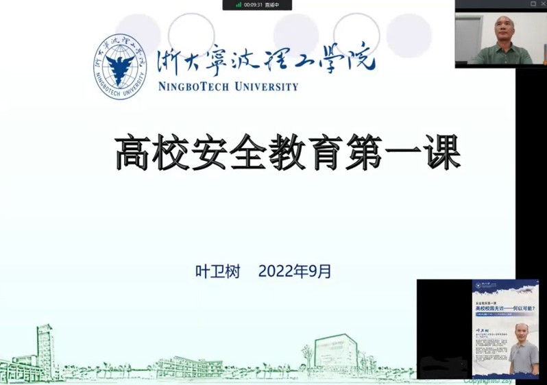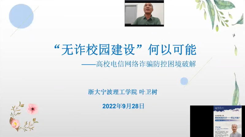 022年9月28日晚,浙江大学软件学院开展新学期安全教育第一课。浙大宁波理工学院设计学院党委副书记、纪委书记叶卫树老师作为嘉宾带来题为《高校校园无诈,何以可能?》的线上直播讲座,来自软件学院的共533名同学参与了本次讲座。