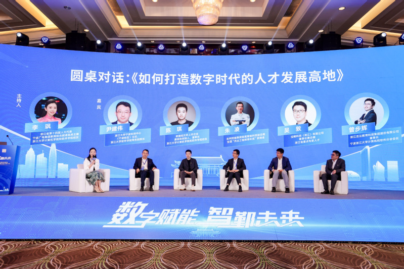 在主旨演讲环节,中国工程院院士、浙江大学原校长潘云鹤教授作《AI大模型的发展分析》主旨演讲,为在座嘉宾带来满满干货,并将活动推向了高潮。收尾的圆桌会议则围绕《如何打造数字时代的人才发展高地》主题展开,浙江省第十四届人大代表、宁波广电集团新闻频道首席主播、浙江大学计算机学院和软件学院校友李飒、浙江大学宁波科创中心(宁波校区)主任、浙江大学软件学院常务副院长尹建伟,美国纽交所上市企业蘑菇街创始人、董事长、浙江大学计算机学院和软件学院校友陈琪,吉利控股集团极氪智能科技副总裁、全国“杰出工程师青年奖”获得者朱凌,宝略科技(浙江)有限公司董事长兼总裁、浙江省“万人计划”青年拔尖人才吴敦,浙江吉云教育科技集团股份有限公司董事长、宁波浙江大学计算机和软件分会会长曾步辉等多位企业家代表进行了深度交流,探讨人才培养,让更多数字人才在“大浪淘沙”中成长为行业先驱。