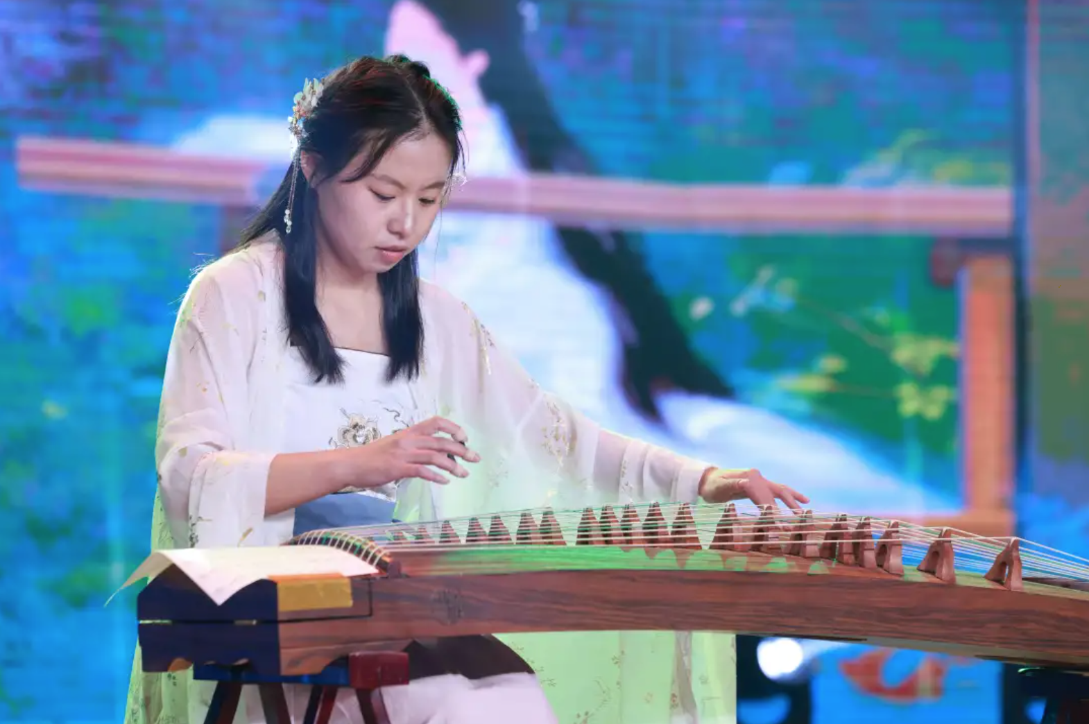 李庆龄带来的《青花瓷》琴音荡漾,仿佛古老的故事在耳畔低语。每一弦的挑动都是岁月的沉淀,每一个音符都是心灵的波澜。