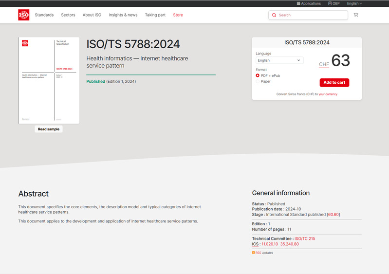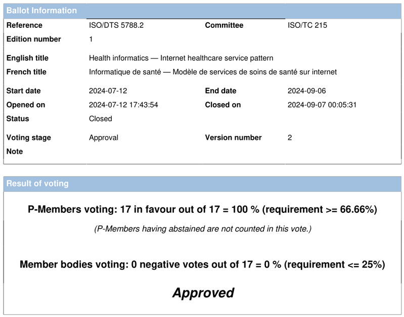 由我院尹建伟教授牵头申报的国际标准ISO/TS 5788:2024 Health informatics — Internet healthcare service pattern 《健康信息学 互联网医疗健康服务模式》在经过为期两个月的末轮投票后,获得了来自美国、德国、瑞典、日本等17个国家的赞同票,以百分之一百的通过率顺利进入最终阶段并于10月3日在ISO正式发布。