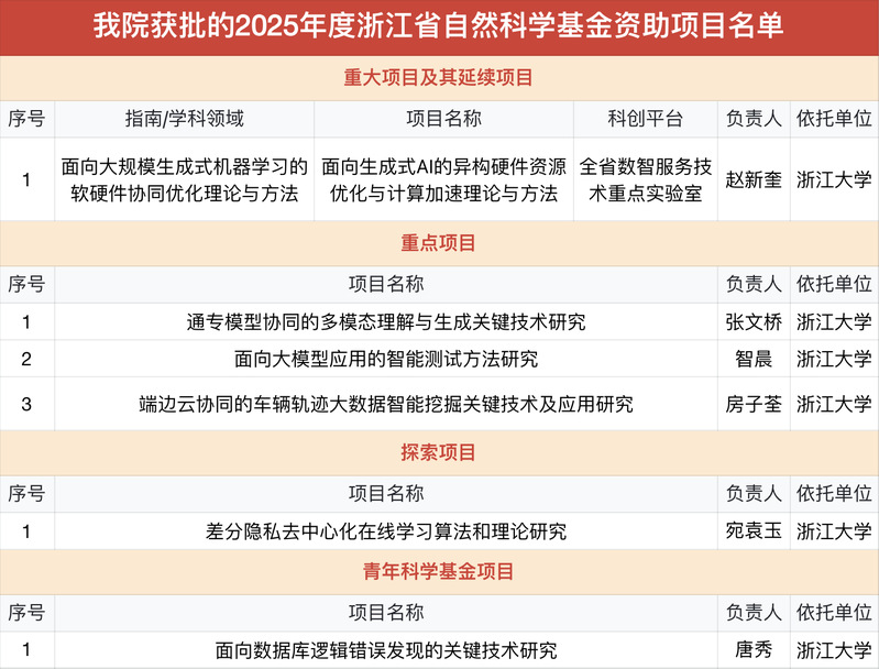 近日,浙江省自然科学基金委员会公布了2025年度浙江省自然科学基金评审结果,我院共有6个项目入选,其中重大项目及其延续项目1项、重点项目3项、探索项目1项、青年科学基金项目1项,获批率达到了100%!这充分体现了我院积极开展有组织科研,聚焦高水平、高质量项目,科研实力不断提升。我院获批的2025年度浙江省自然科学基金资助项目名单如下: