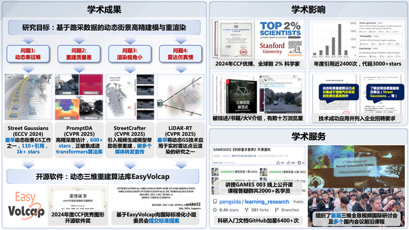 学术成果:过去一年围绕动态街景高精建模与重渲染问题展开研究,针对现有方法动态表征难、重建质量差、渲染视角小、雷达仿真慢四个局限,提出了动态三维街景表征构建与先验学习系列工作,包括Street Gaussians(ECCV 2024)、PromptDA(CVPR 2025)、StreetCrafter(CVPR 2025)、LiDAR-RT(CVPR 2025)。构建动态三维重建开源算法库EasyVolcap,获评2024年CCF优秀图形开源软件奖,并向国际标准化小组委员会提交了标准提案。